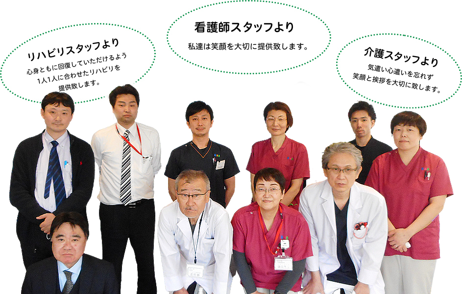 理学療法士、作業療法士などリハビリテーション専門職が担当します。家庭復帰などご本人、ご家族が望まれる目標に近づける事ができるよう、ご利用者様に適したプログラムを立案し提供させていただきます。