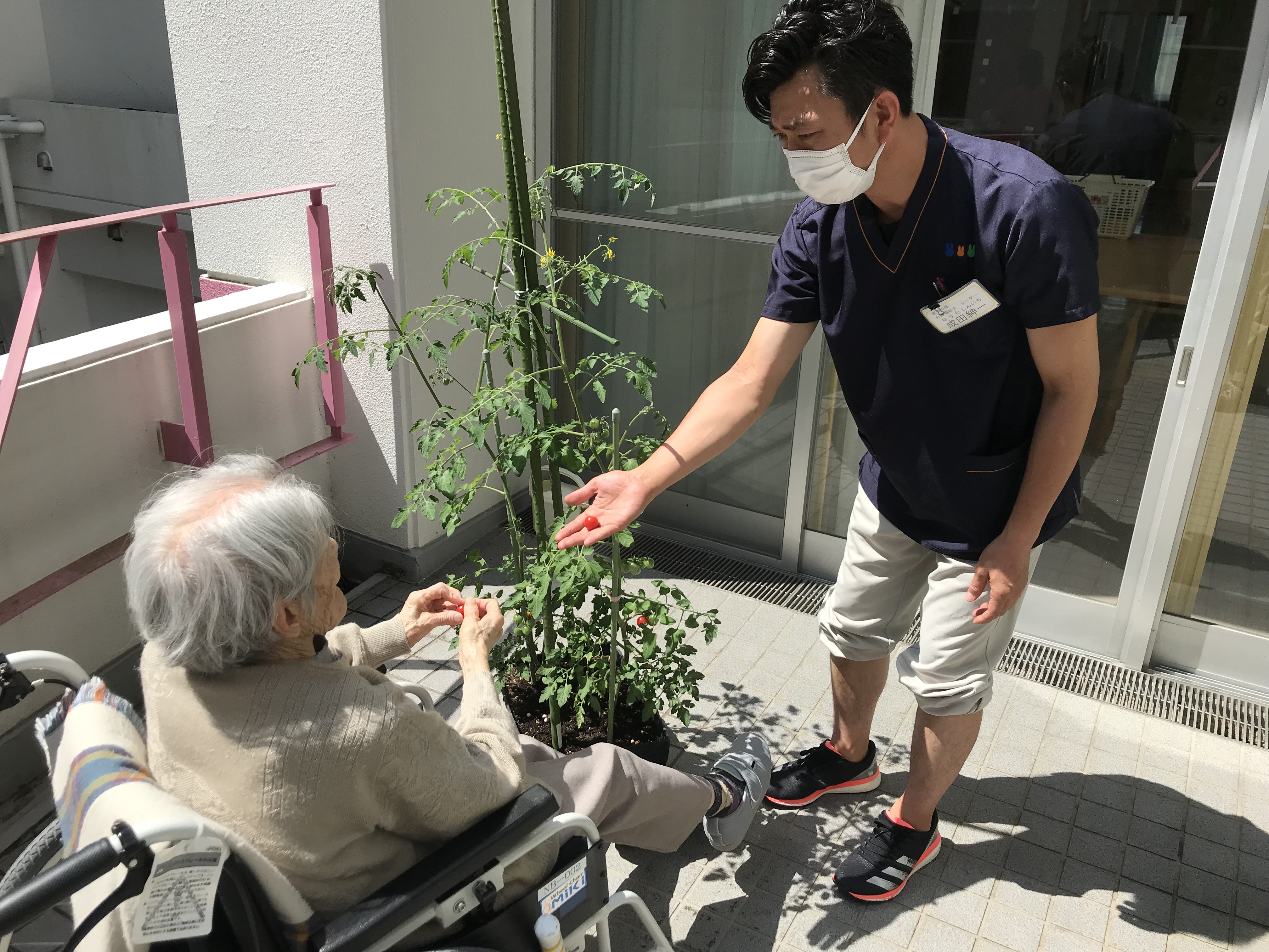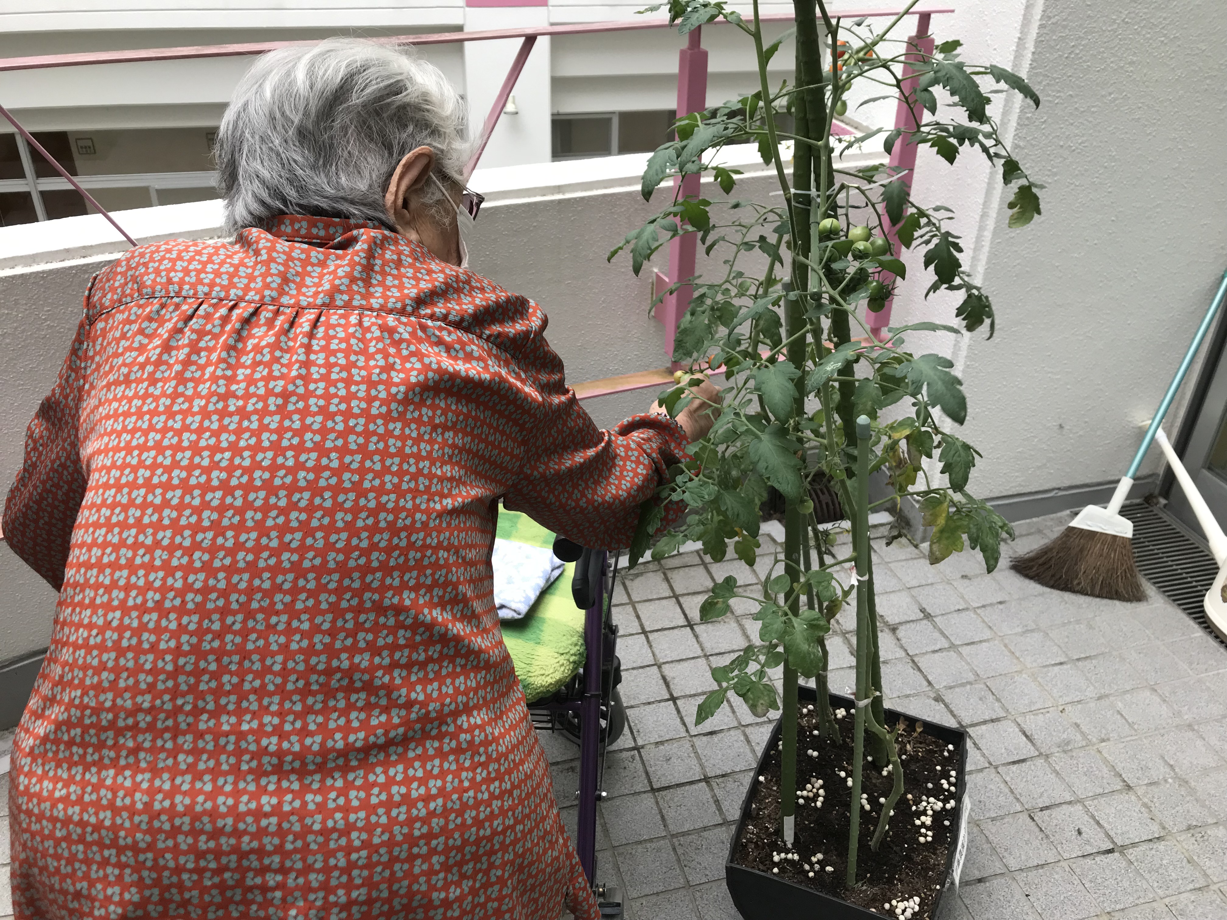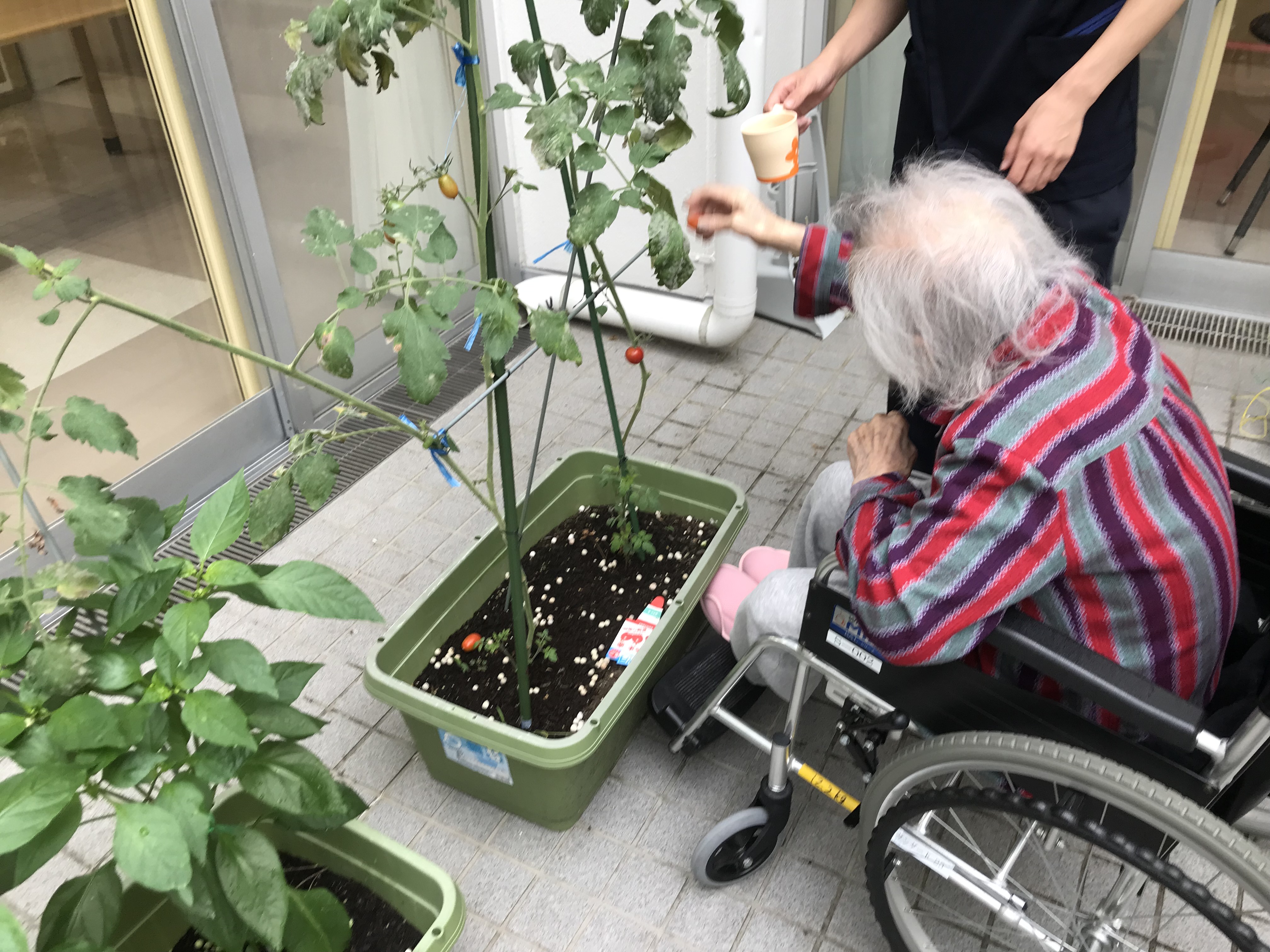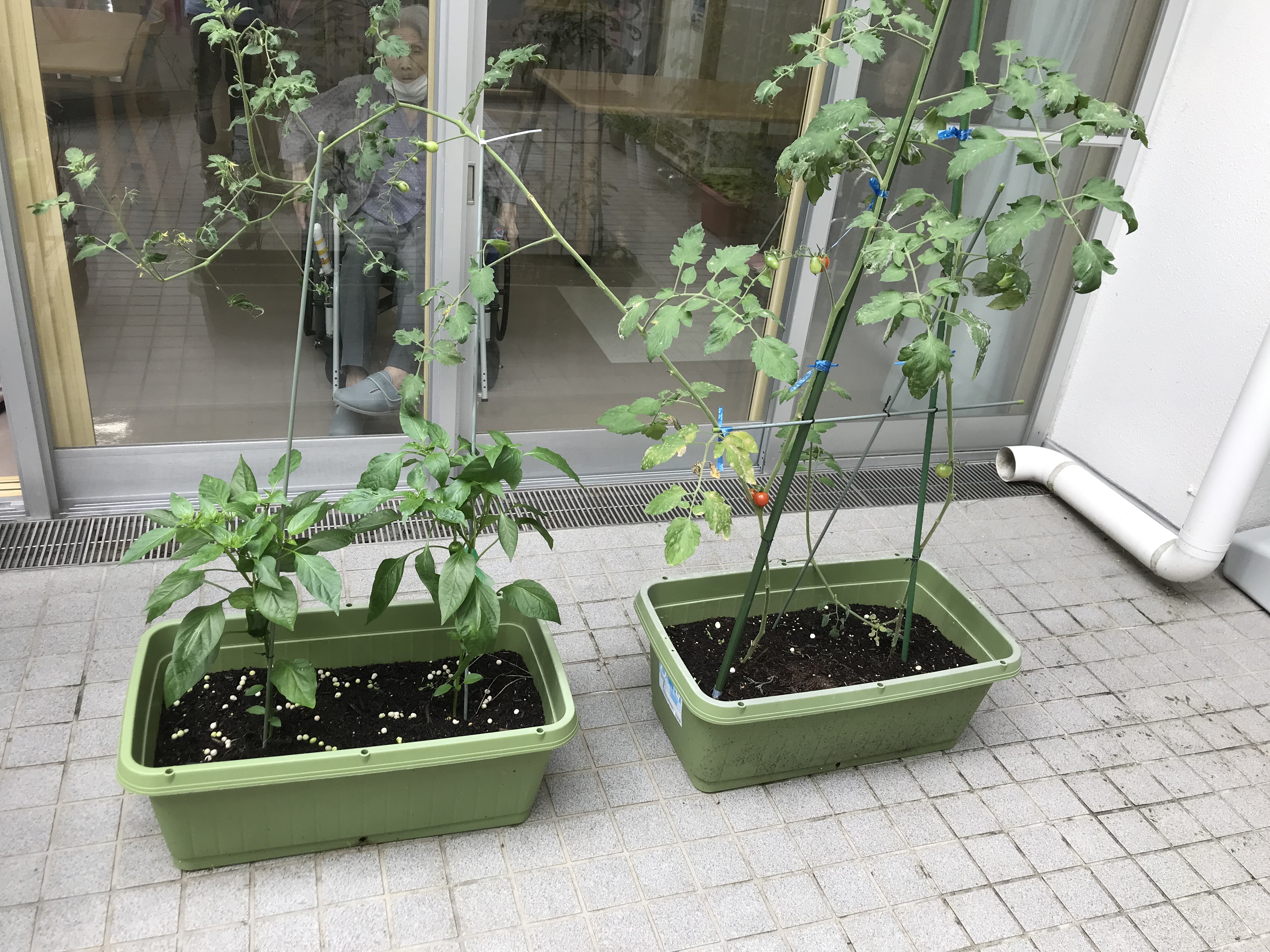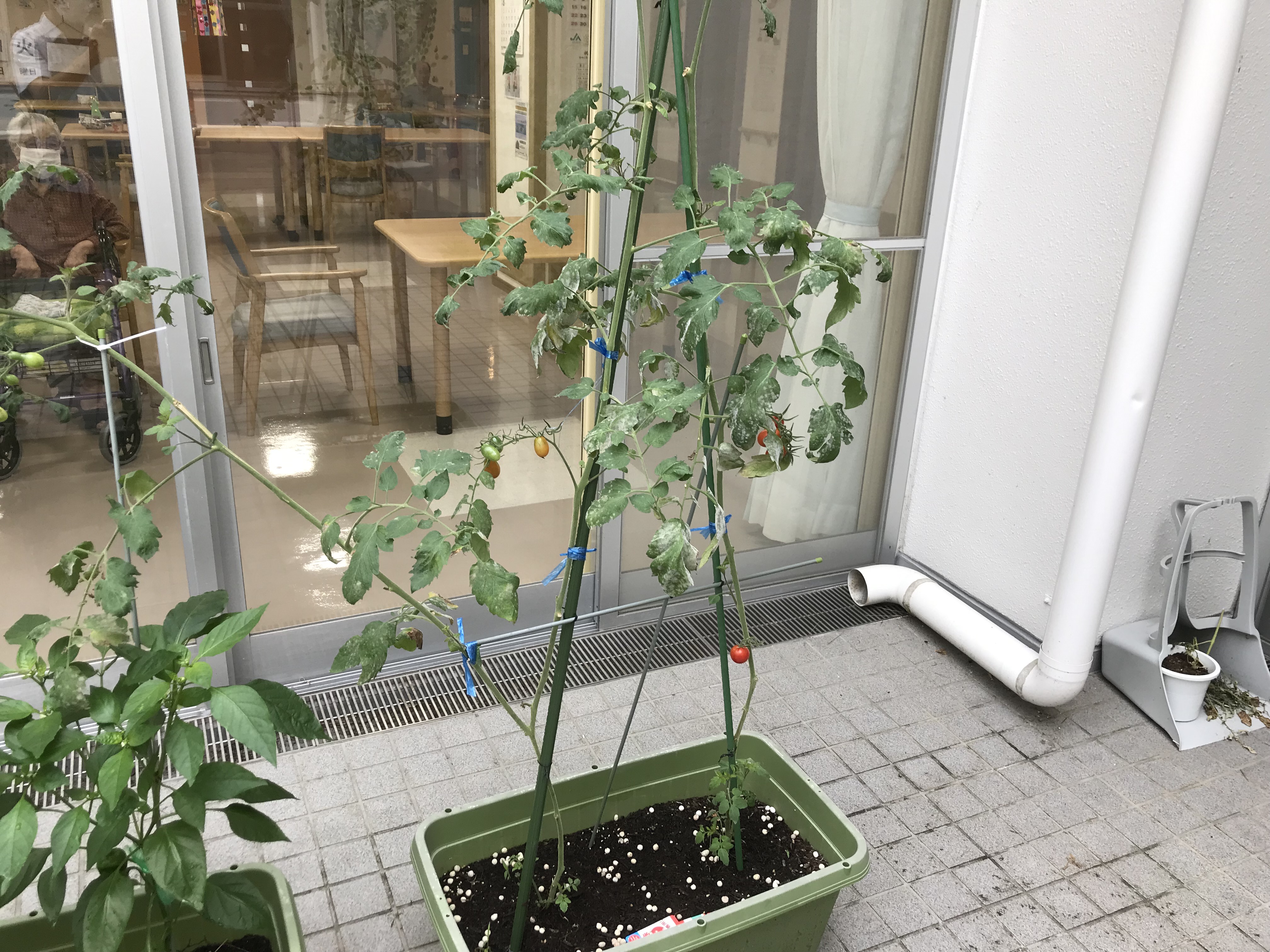 サポーターの方々に植えて頂いたトマトが色づいたので、本日は入所者の方たちと初収穫をしました。2種類のトマトを食べ比べました。ミニトマトは種類が違うと味や固さも違うんだと驚いていました。