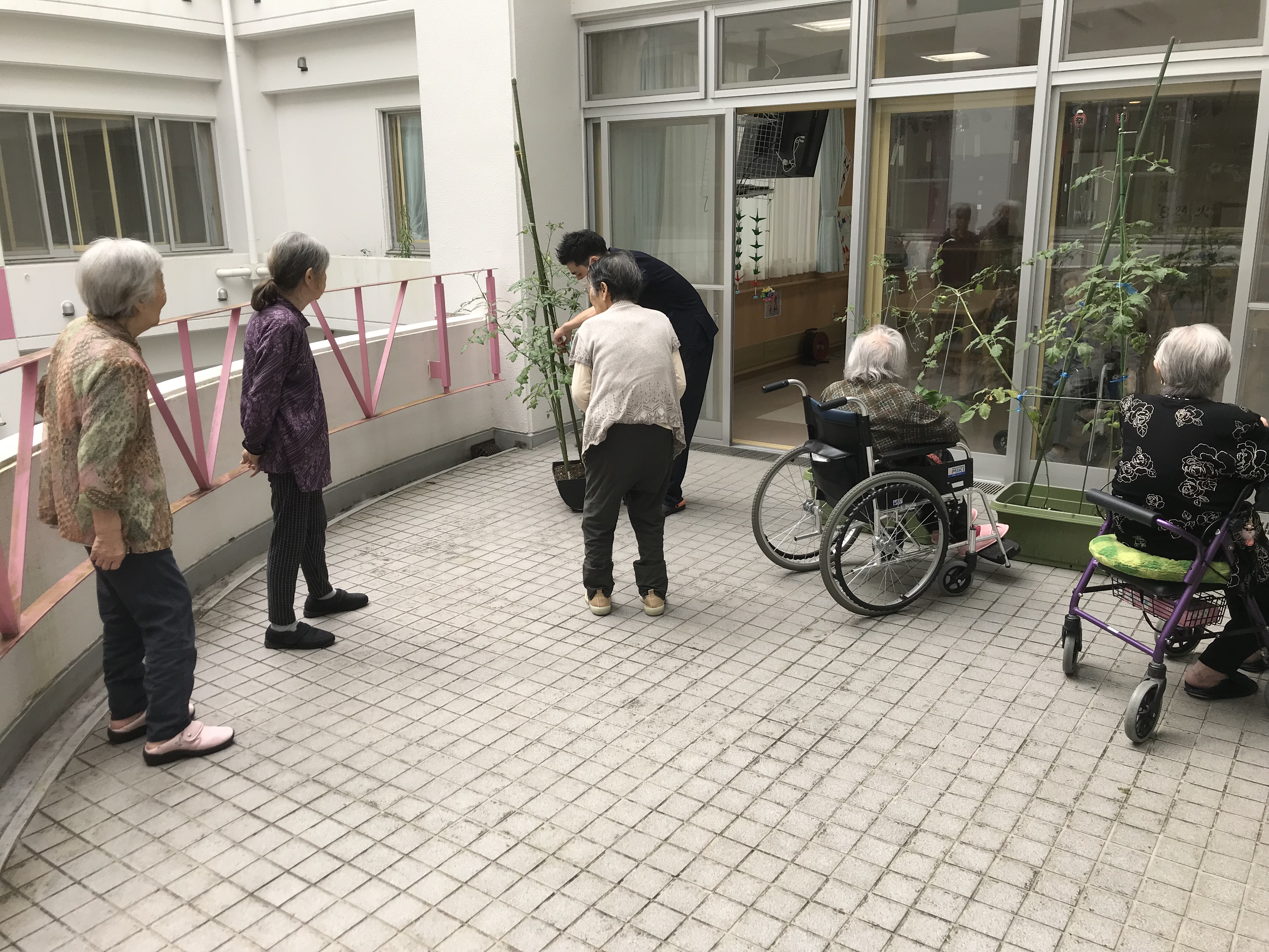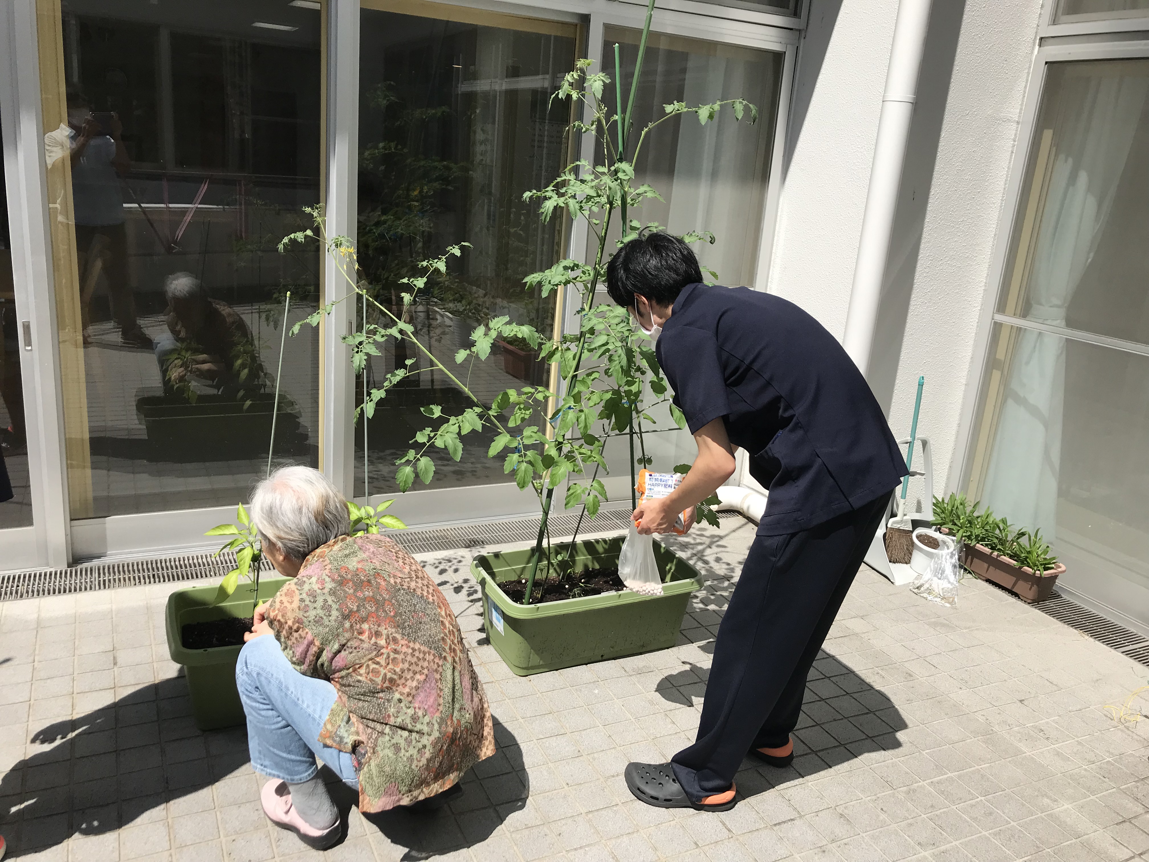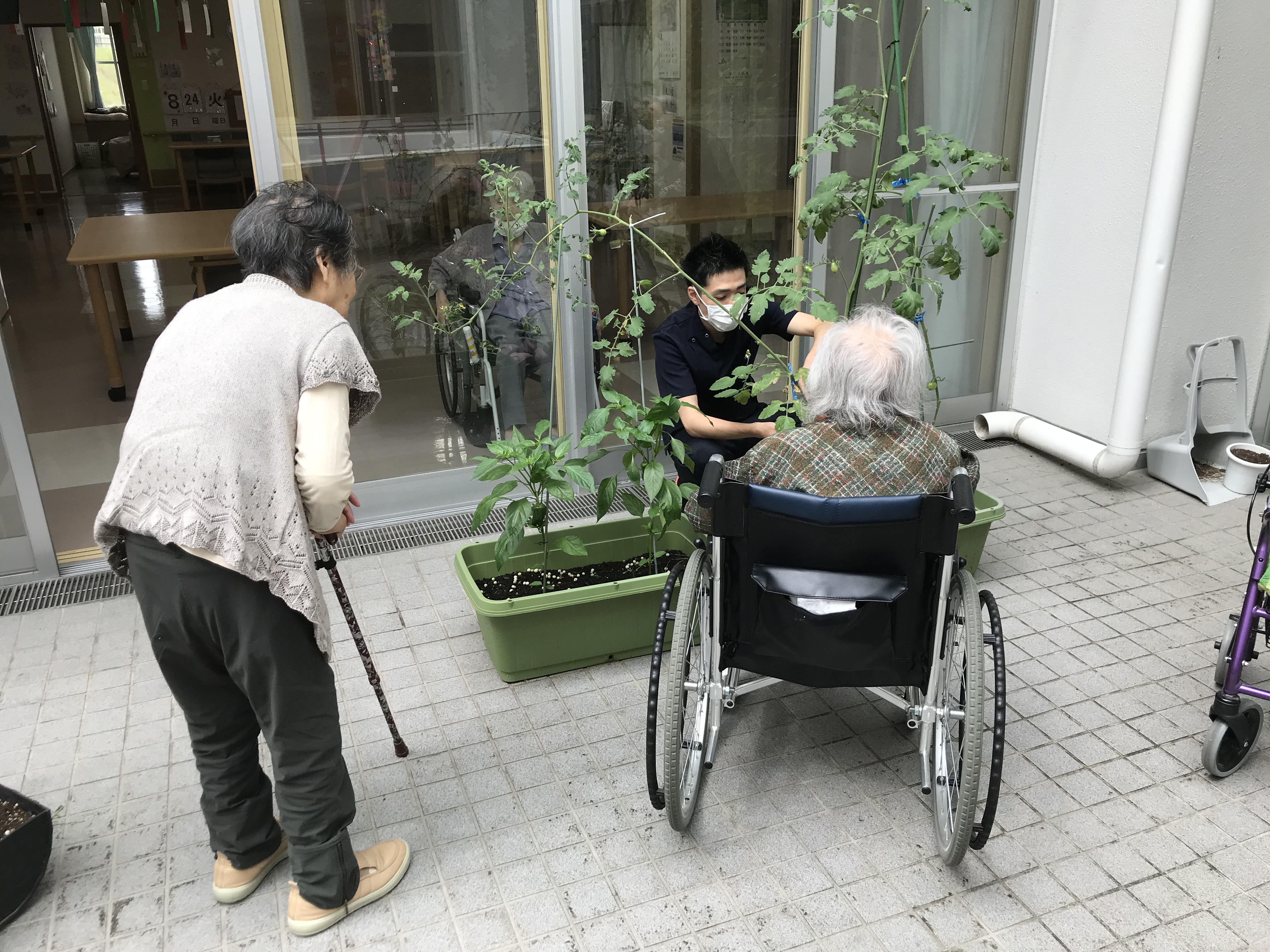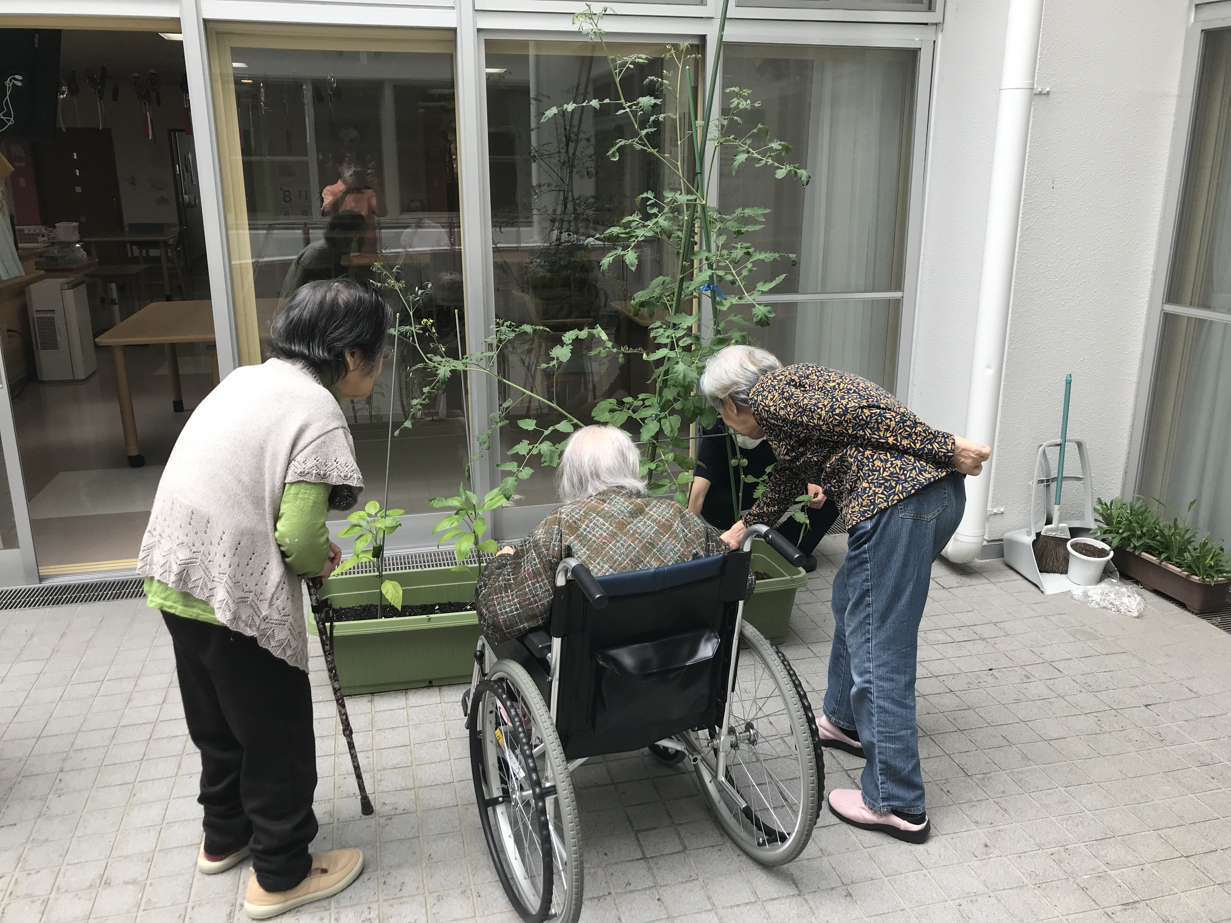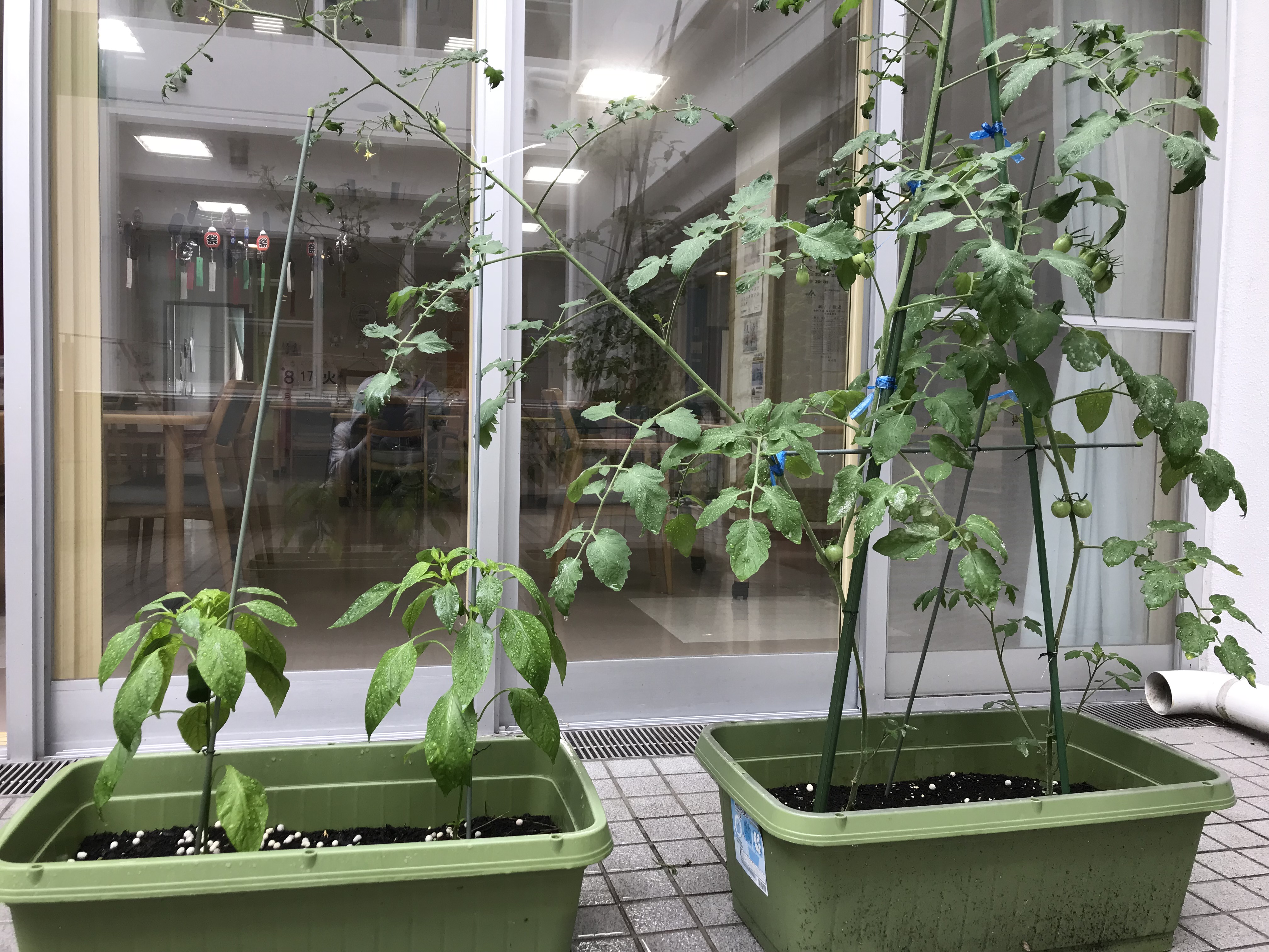 サポーターの方々に植えて頂いたトマトが色づいたので、本日は入所者の方たちと初収穫をしました。2種類のトマトを食べ比べました。ミニトマトは種類が違うと味や固さも違うんだと驚いていました。