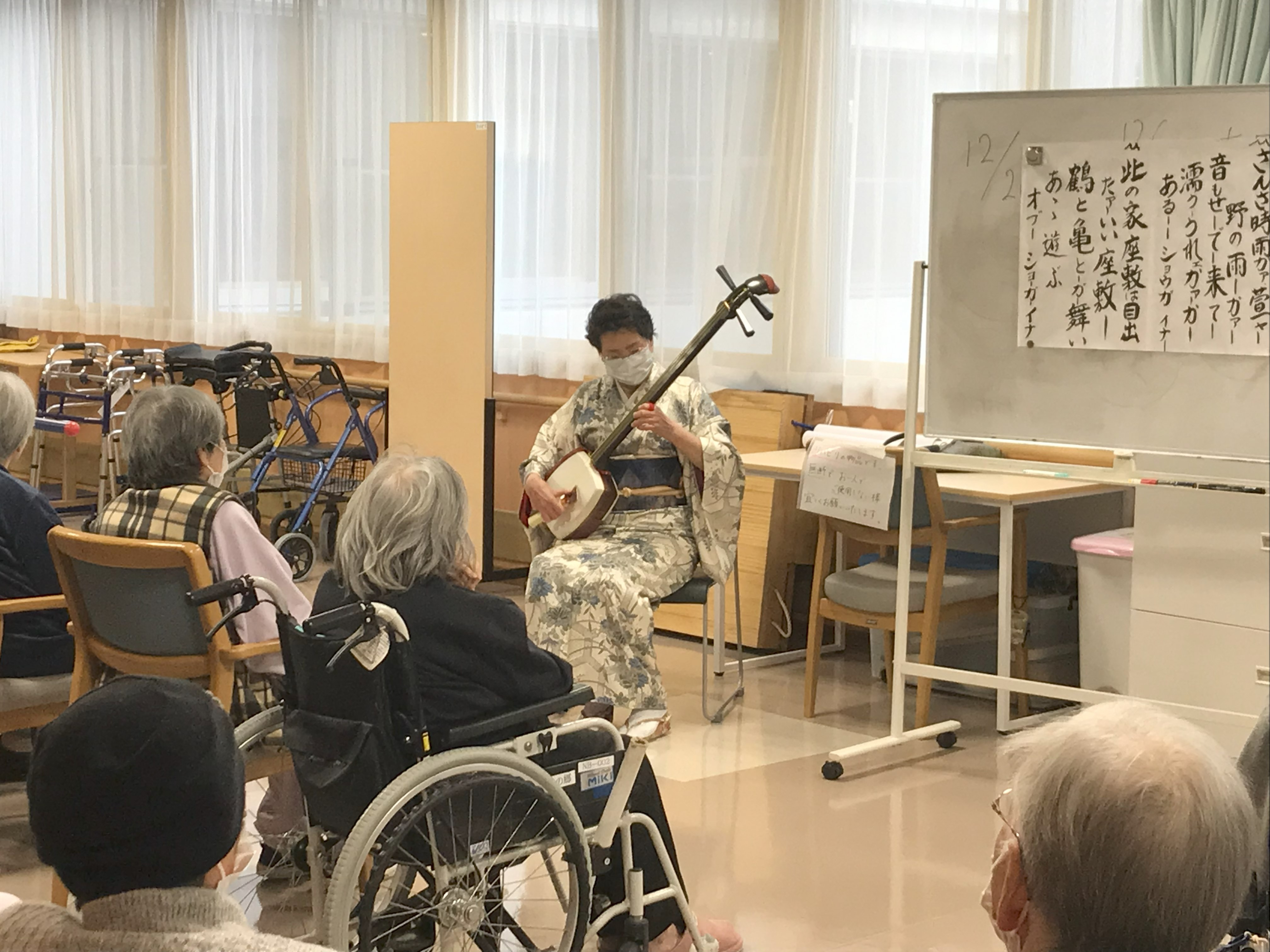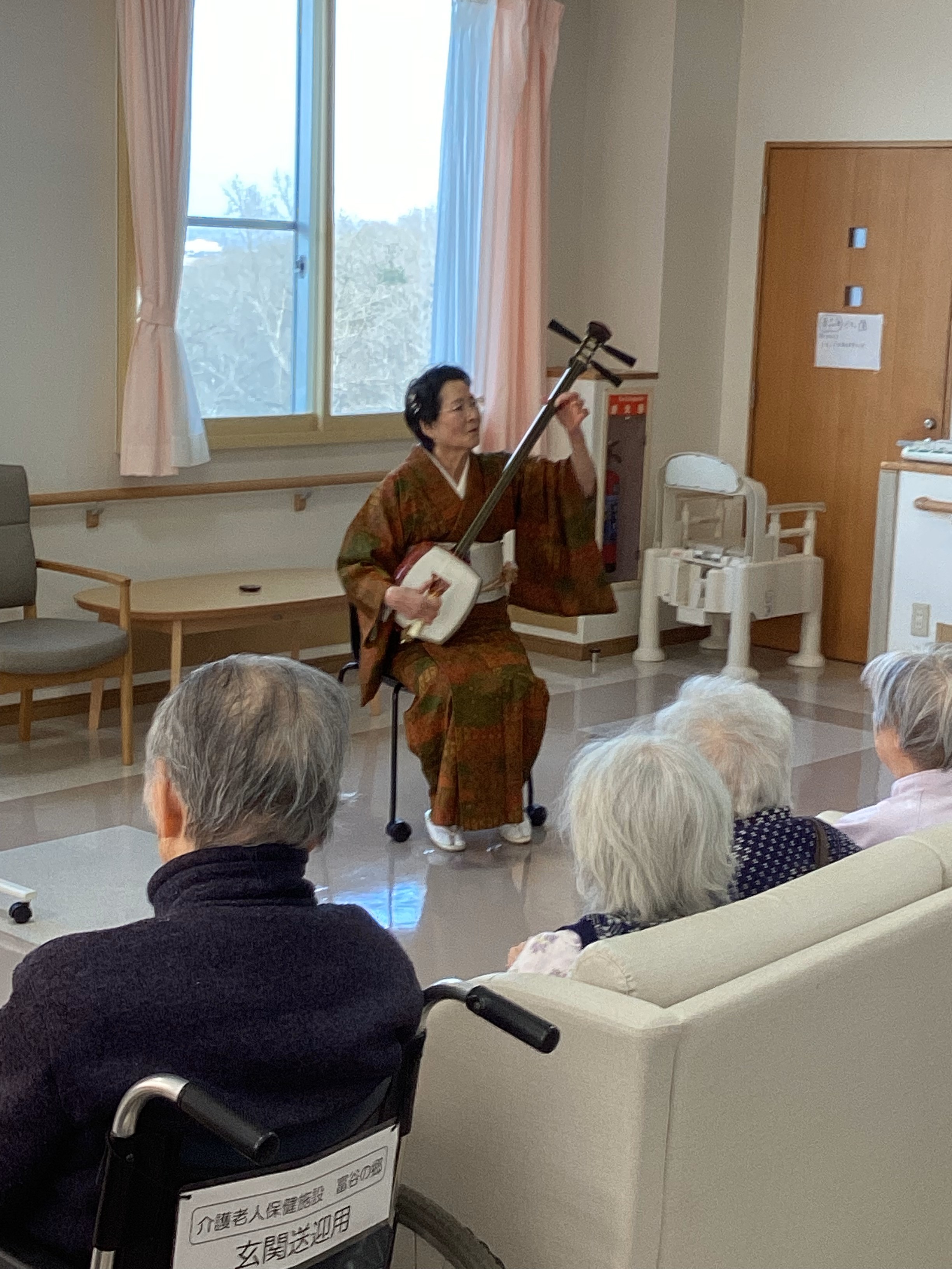 今回、ご厚意により三味線を弾いていただき、唄を一緒に歌ったり皆様楽しまれておりました。