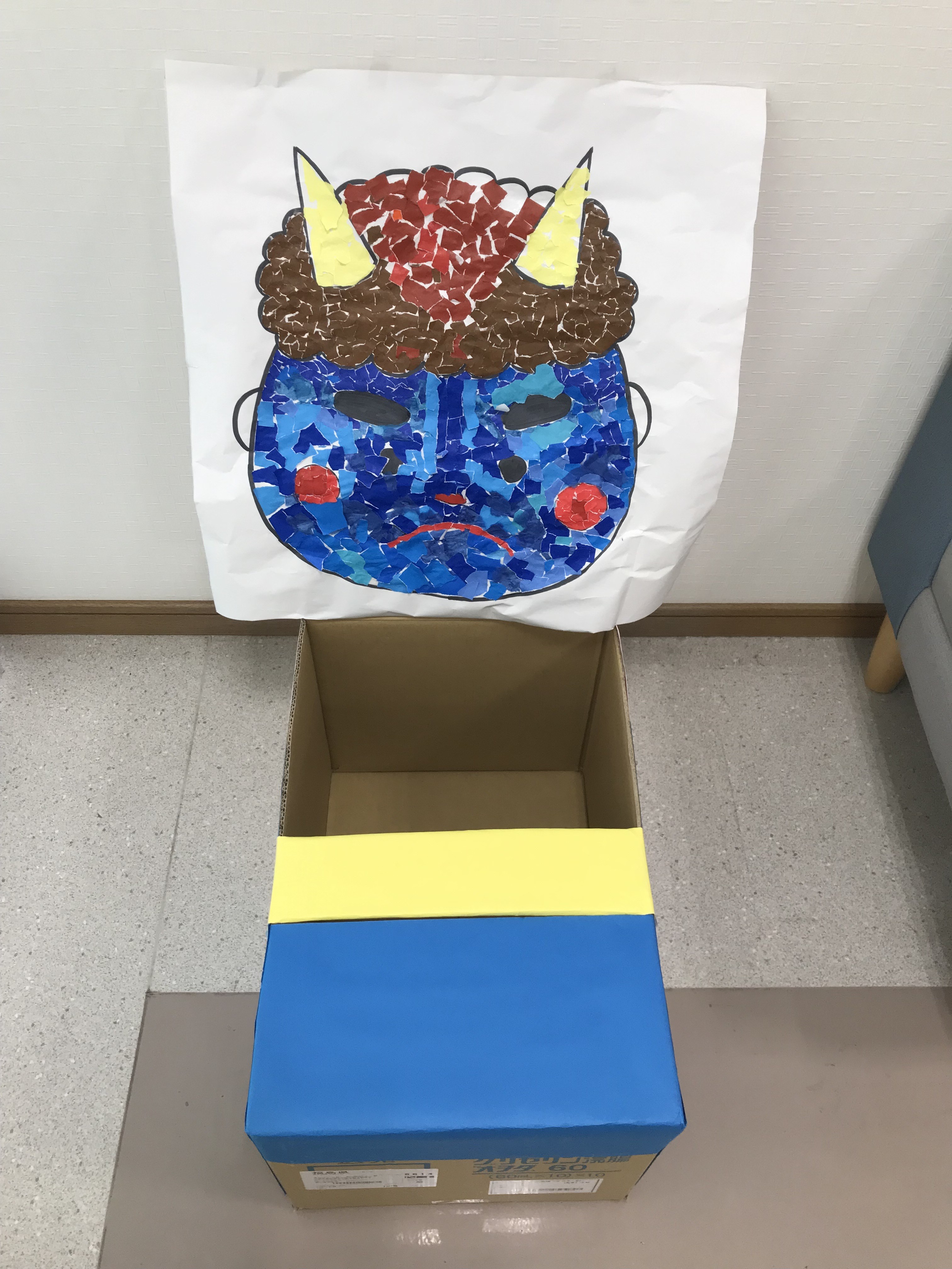 段ボールで鬼を製作し、豆の代わりにお手玉も作成して頂きました。