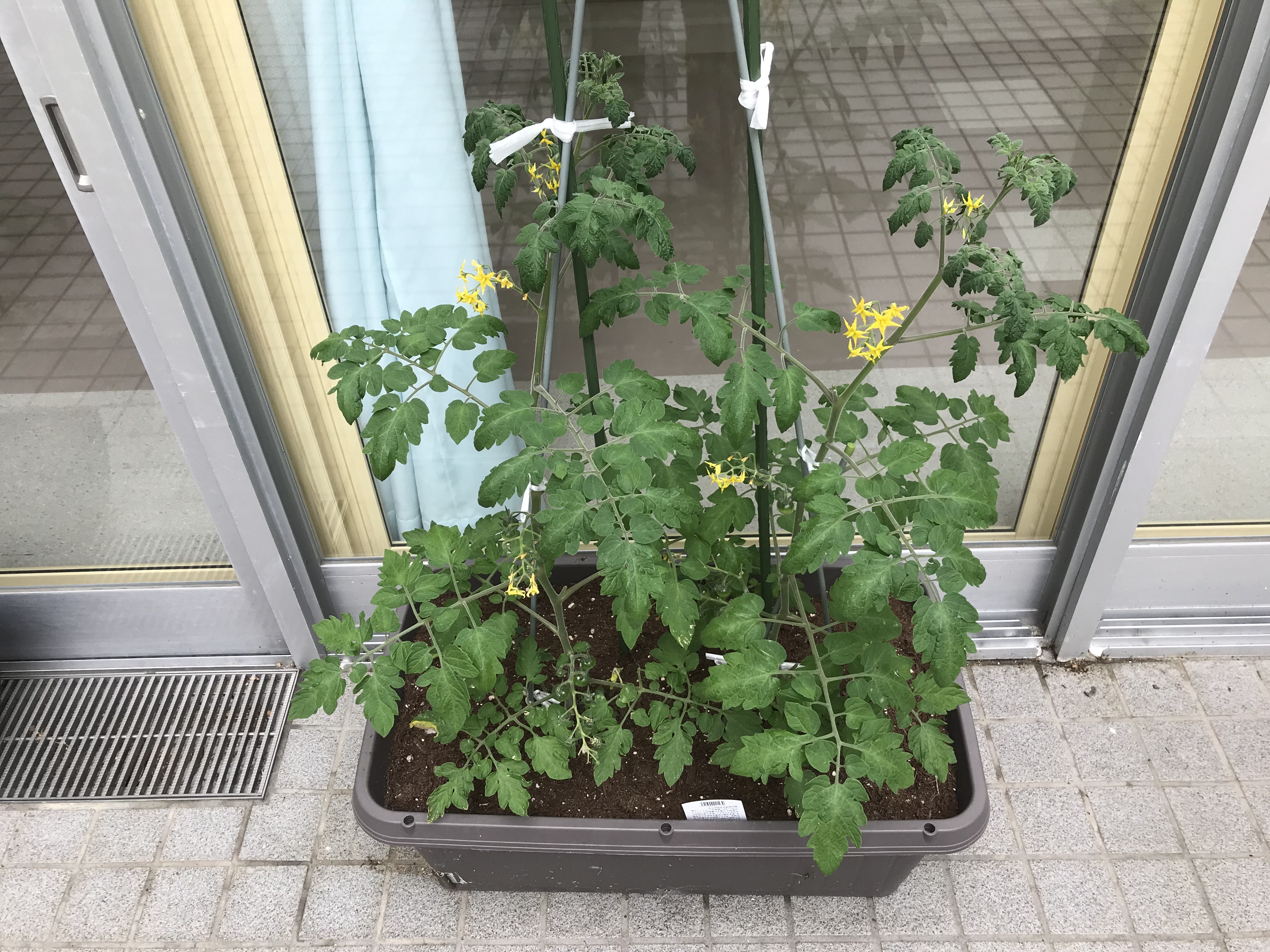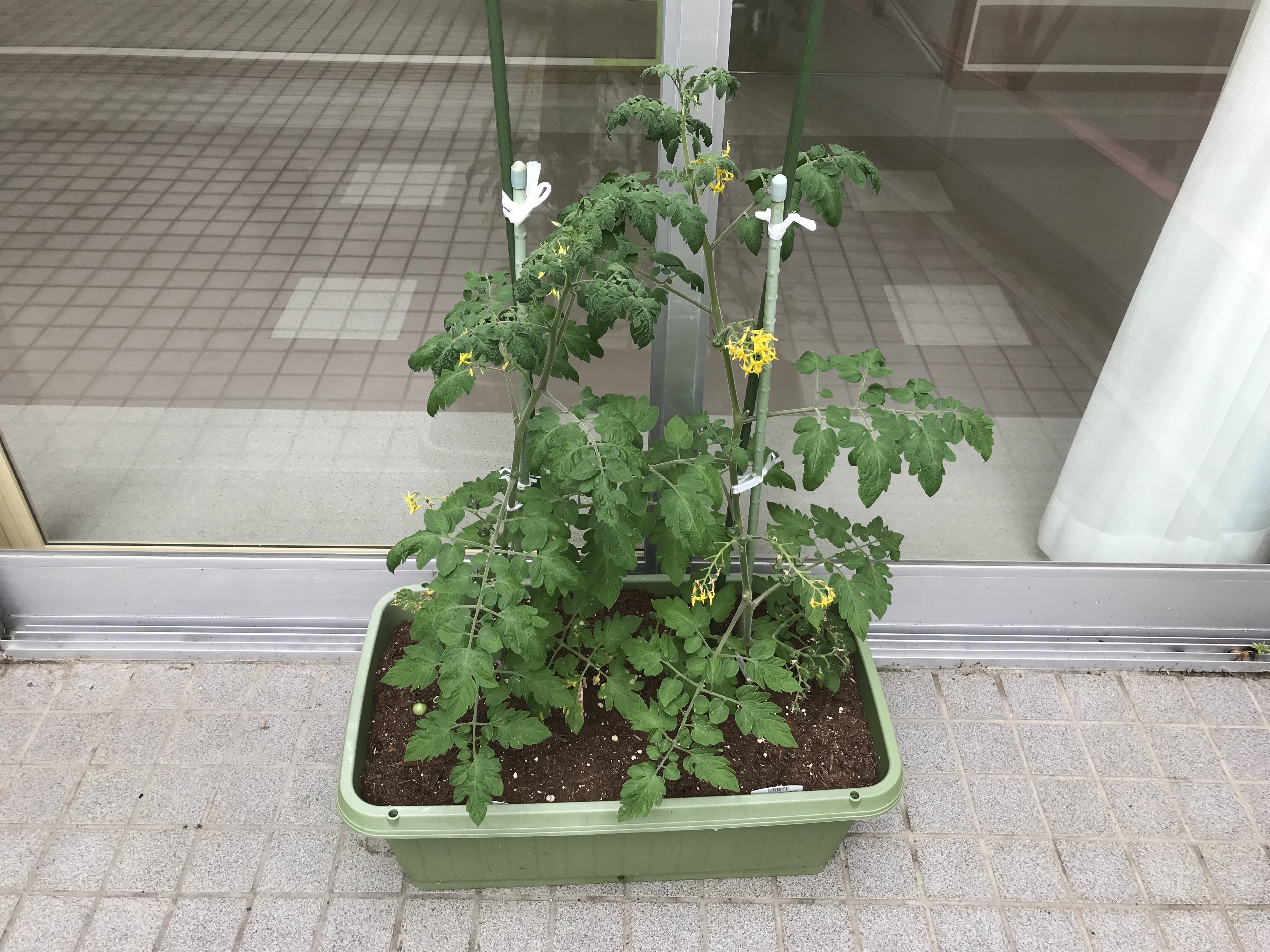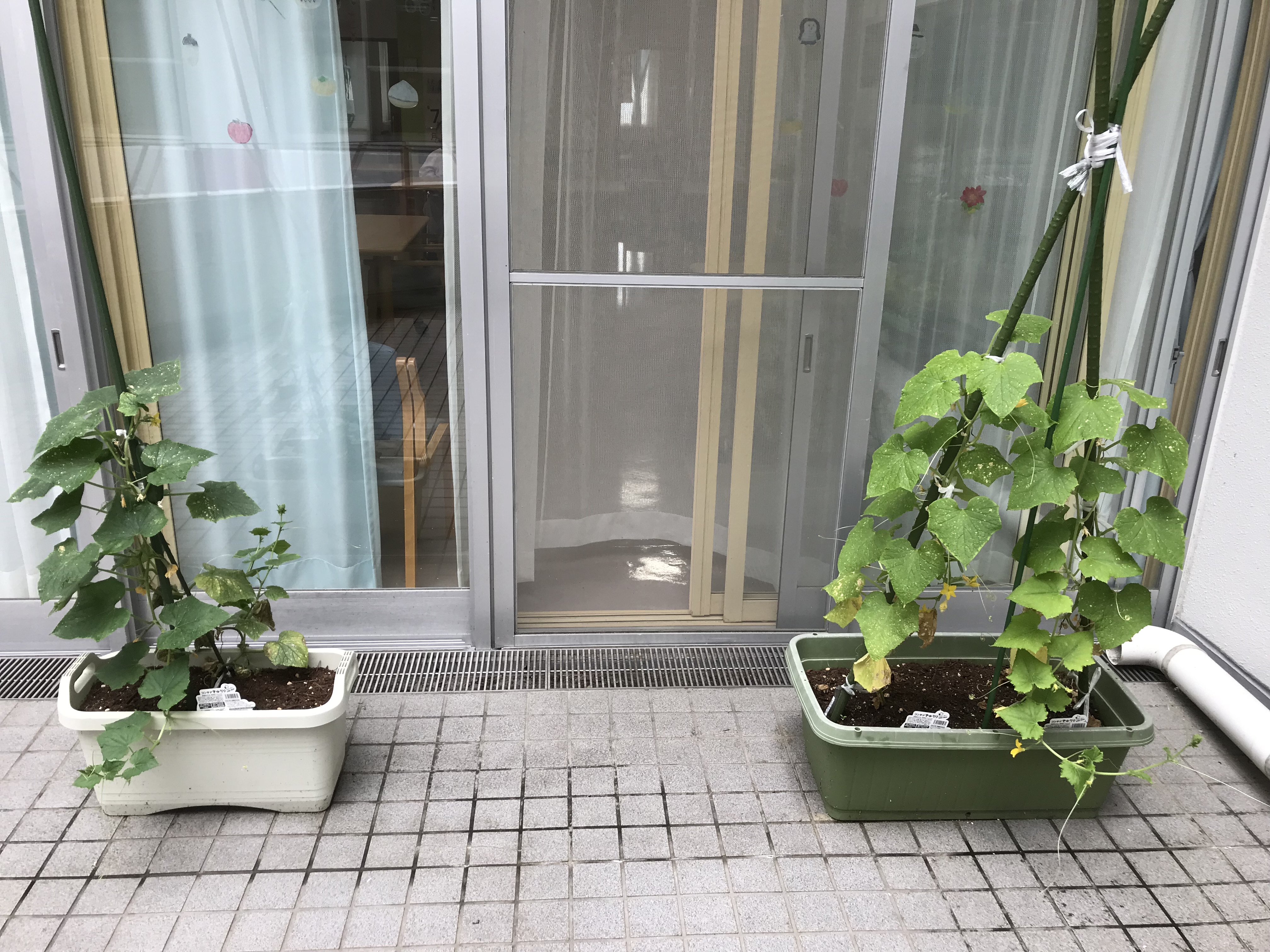 5週間経過しました。トマトもキュウリも順調に育ち、キュウリは10cm程度になりました。