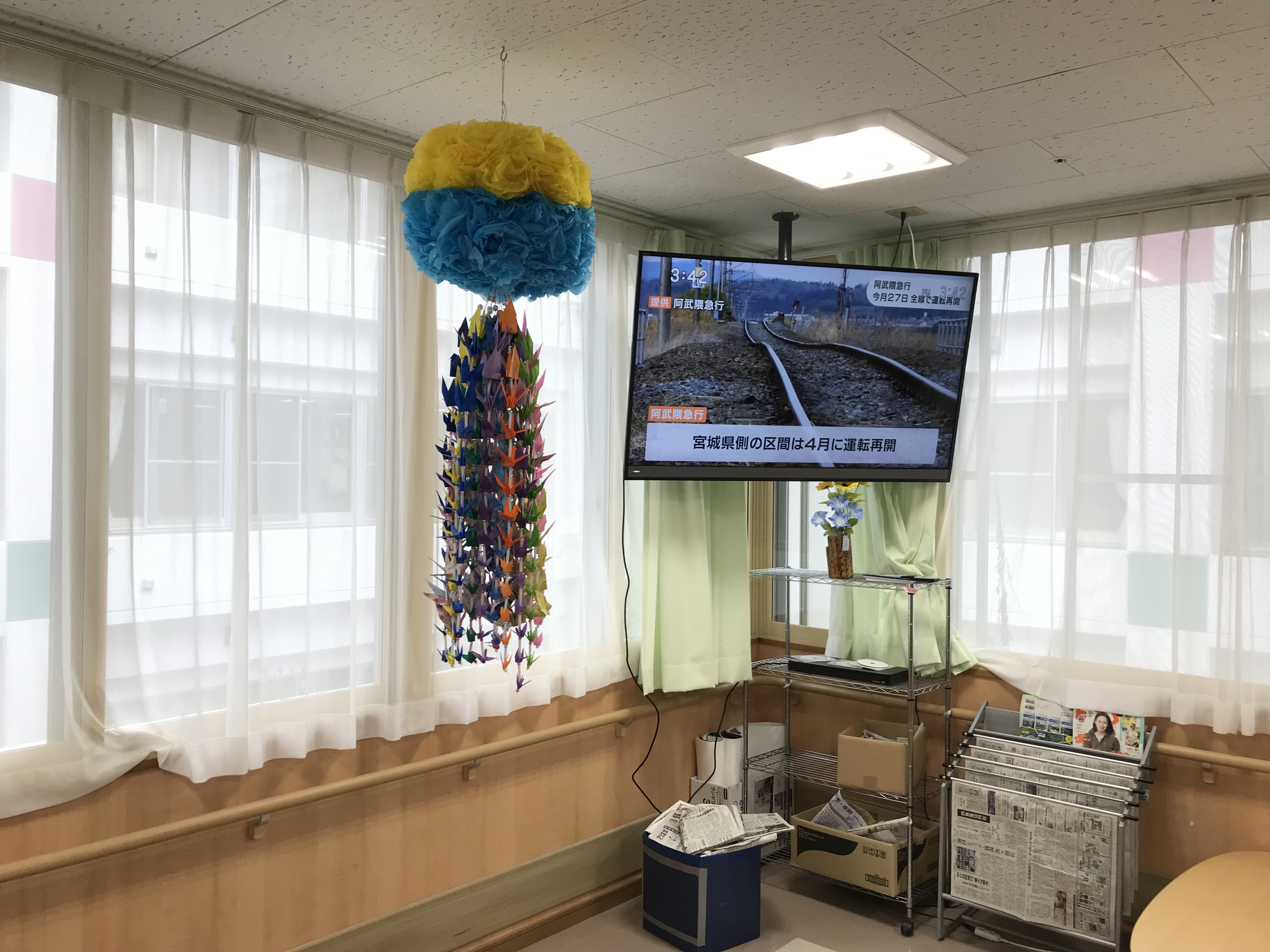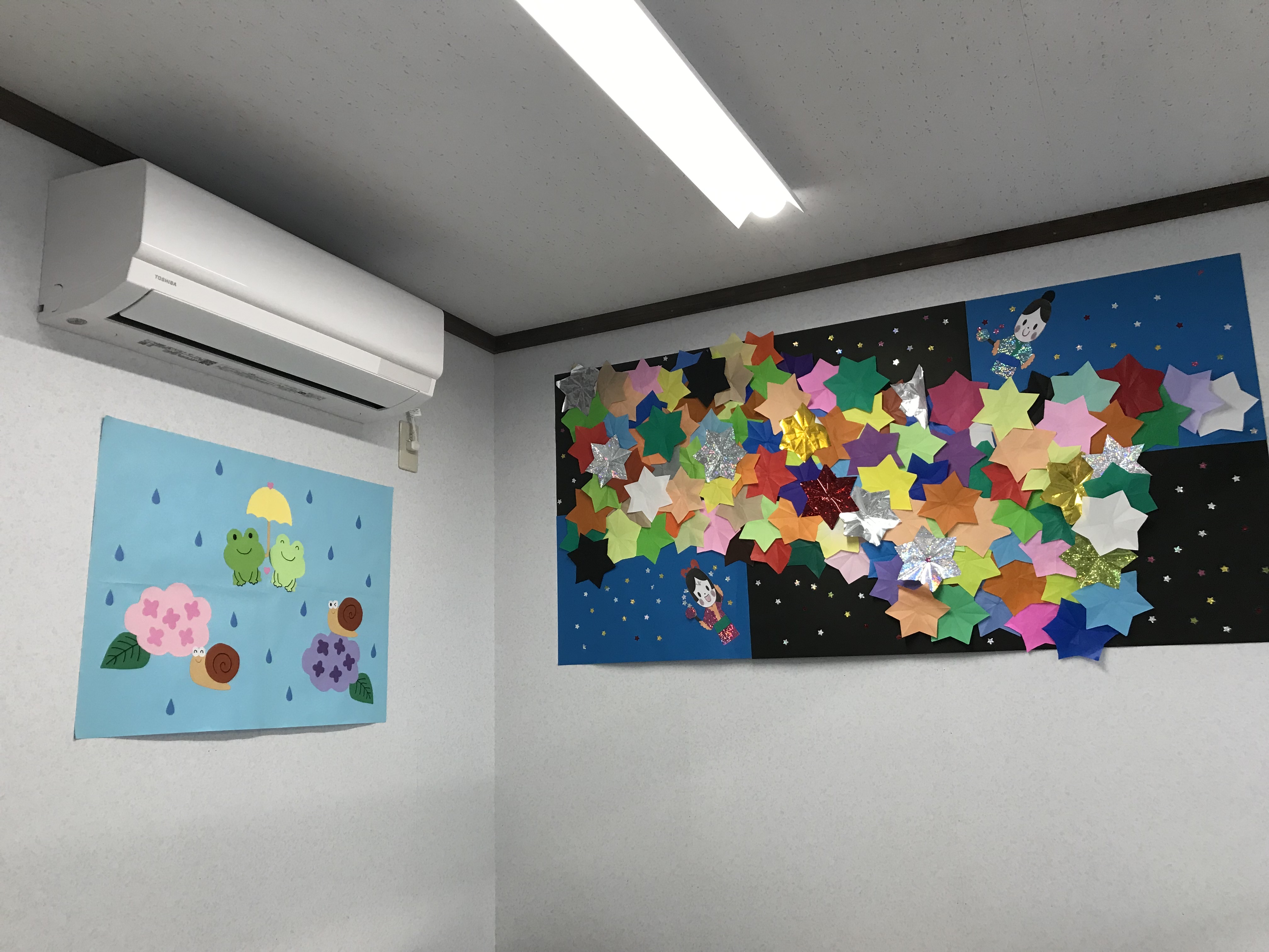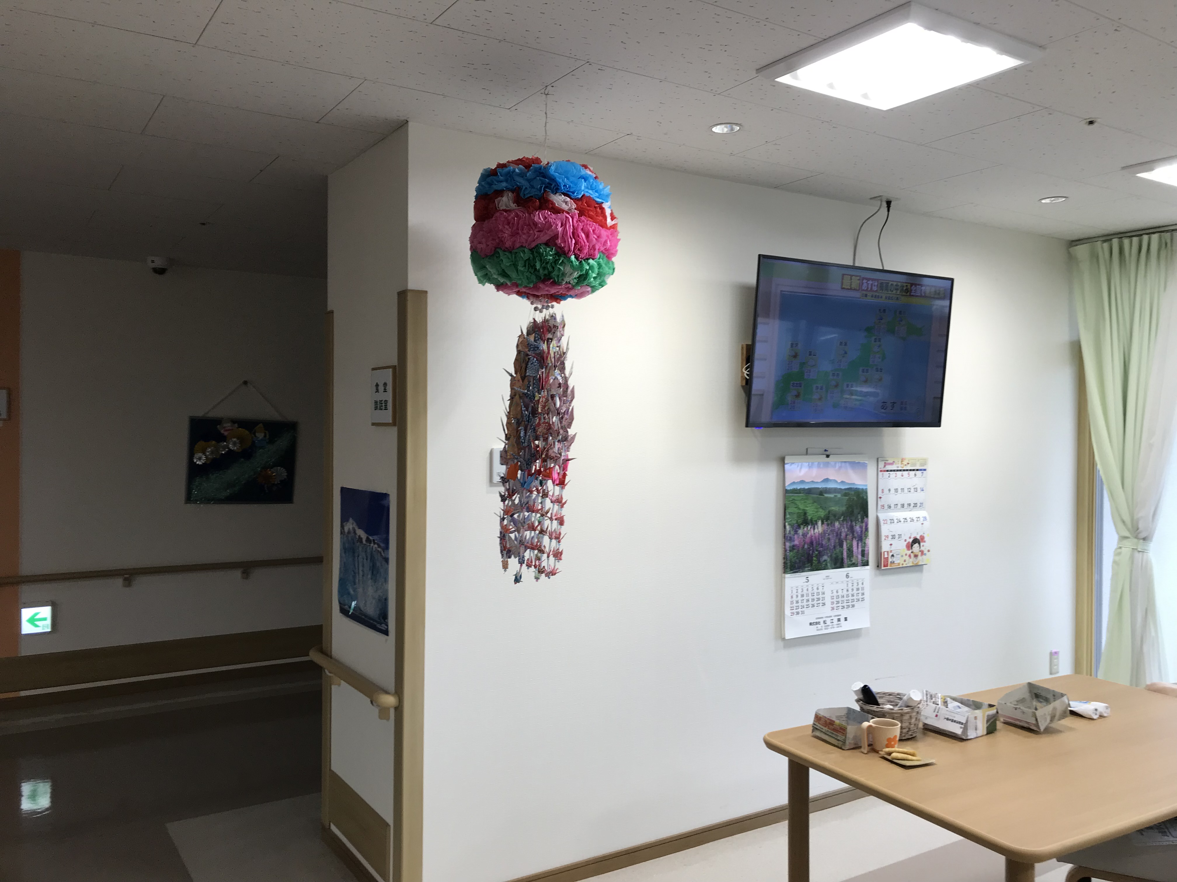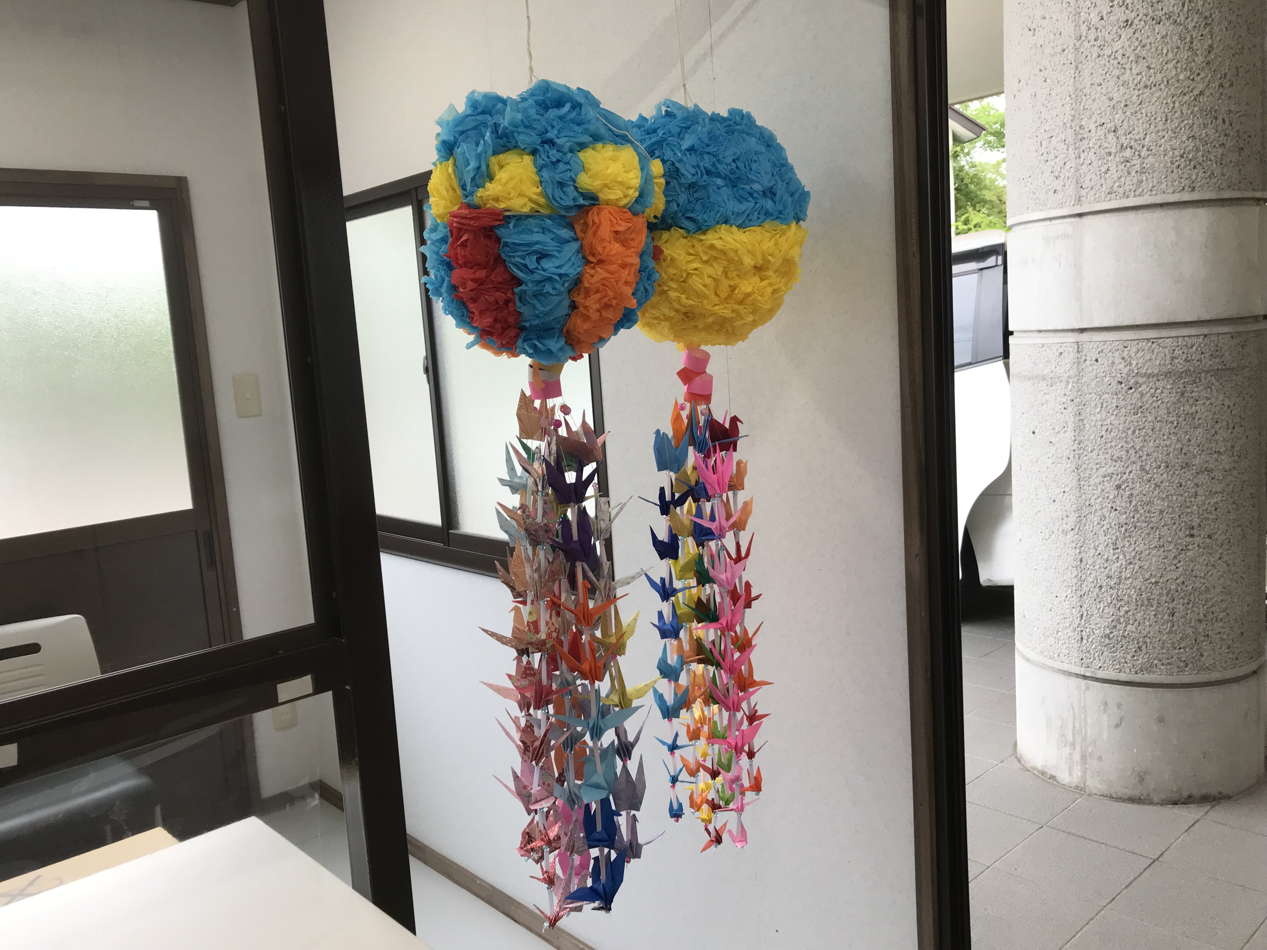 とみサポの方々から、七夕の吹き流し(大サイズ2個は3Fへ、中サイズ2個は面談用ハウスへ)、飾りつけを頂きました。早速飾らせて頂きました。